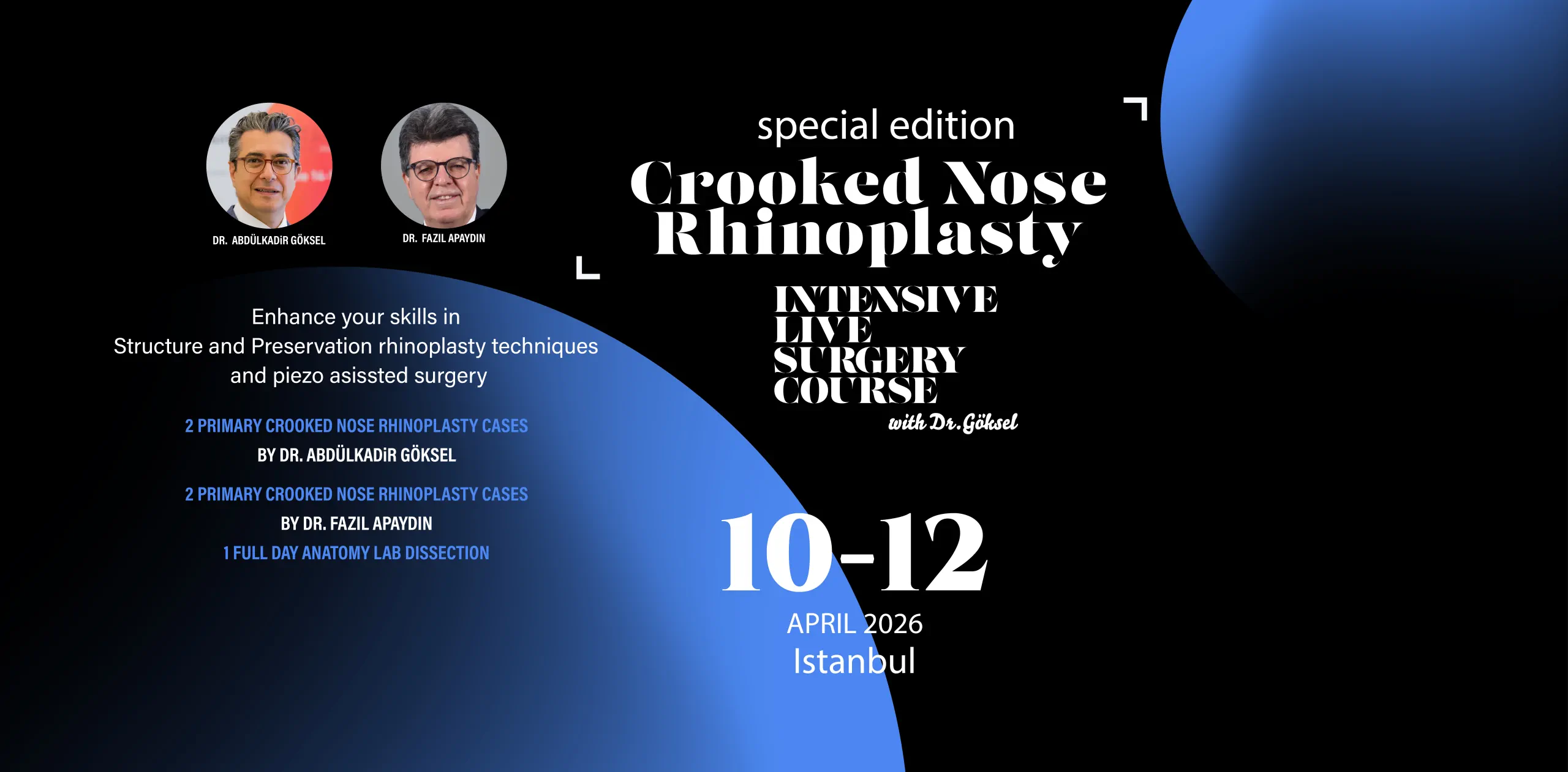 We are pleased to invite you to attend the 9th Special Edition CROOKED NOSE RHINOPLASTY Intensive Live Surgery Course with Dr. Abdülkadir Göksel and Prof. Dr. Fazıl Apaydın, renowned experts in their field. The course will be held between 10-12 April 2026 in Istanbul, and will cover a range of advanced techniques and surgical approaches focused on the correction of the crooked nose.